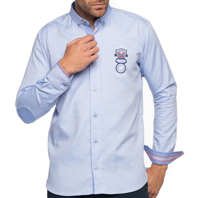 Chemise 100% coton, coupe droite, motif poitrine et coudières, poignets travaillés.